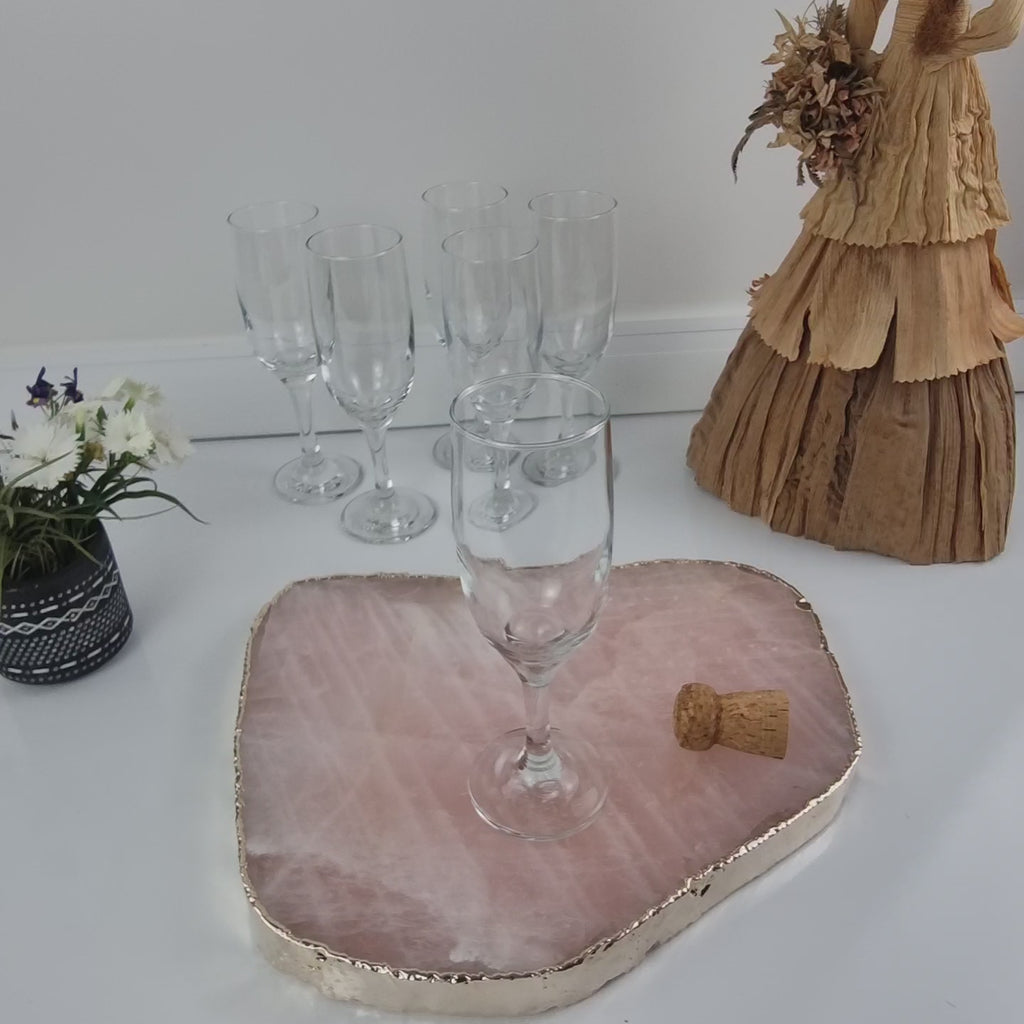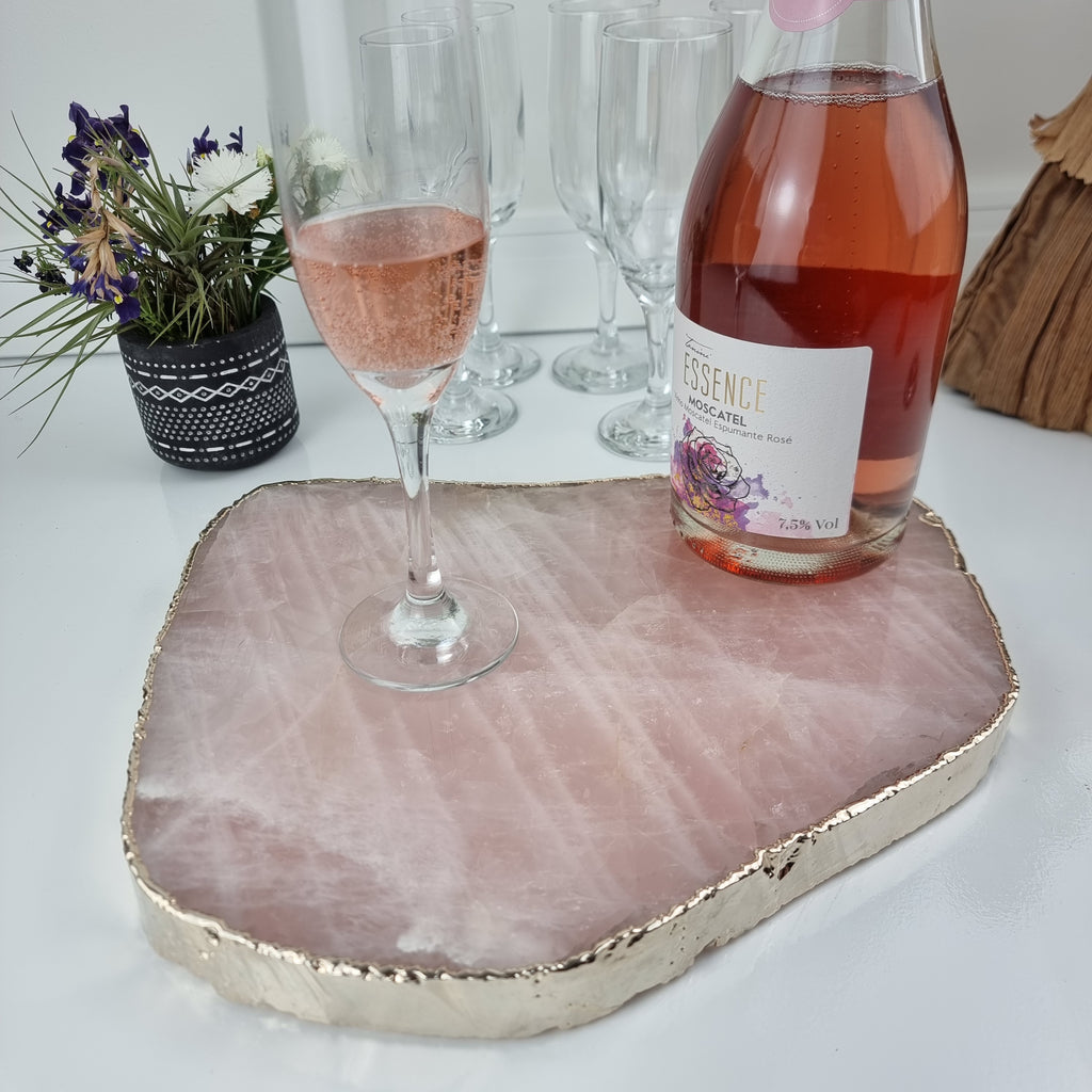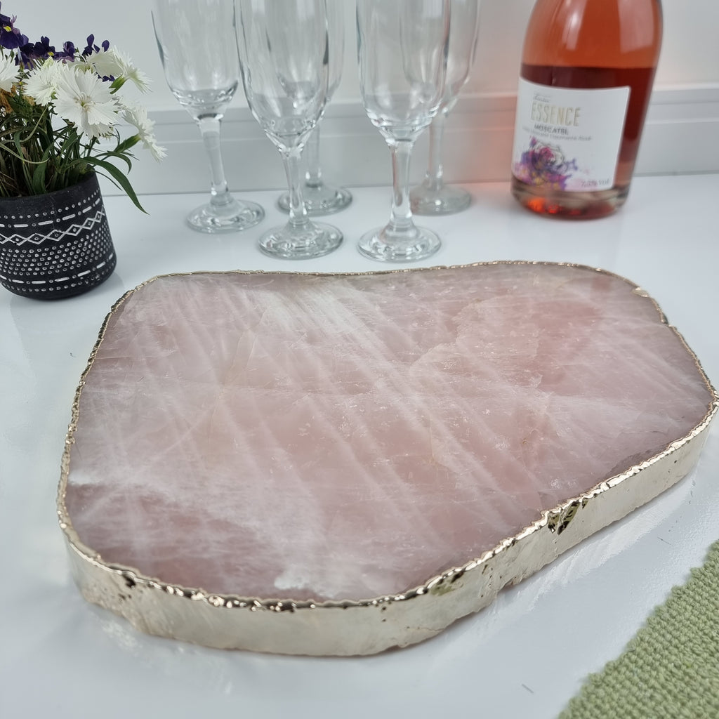 Bandeja de QUARTZO ROSA Bordas Douradas | 1 Unidade | Tamanho 30 cm | Peça Artesanal BR Crystals